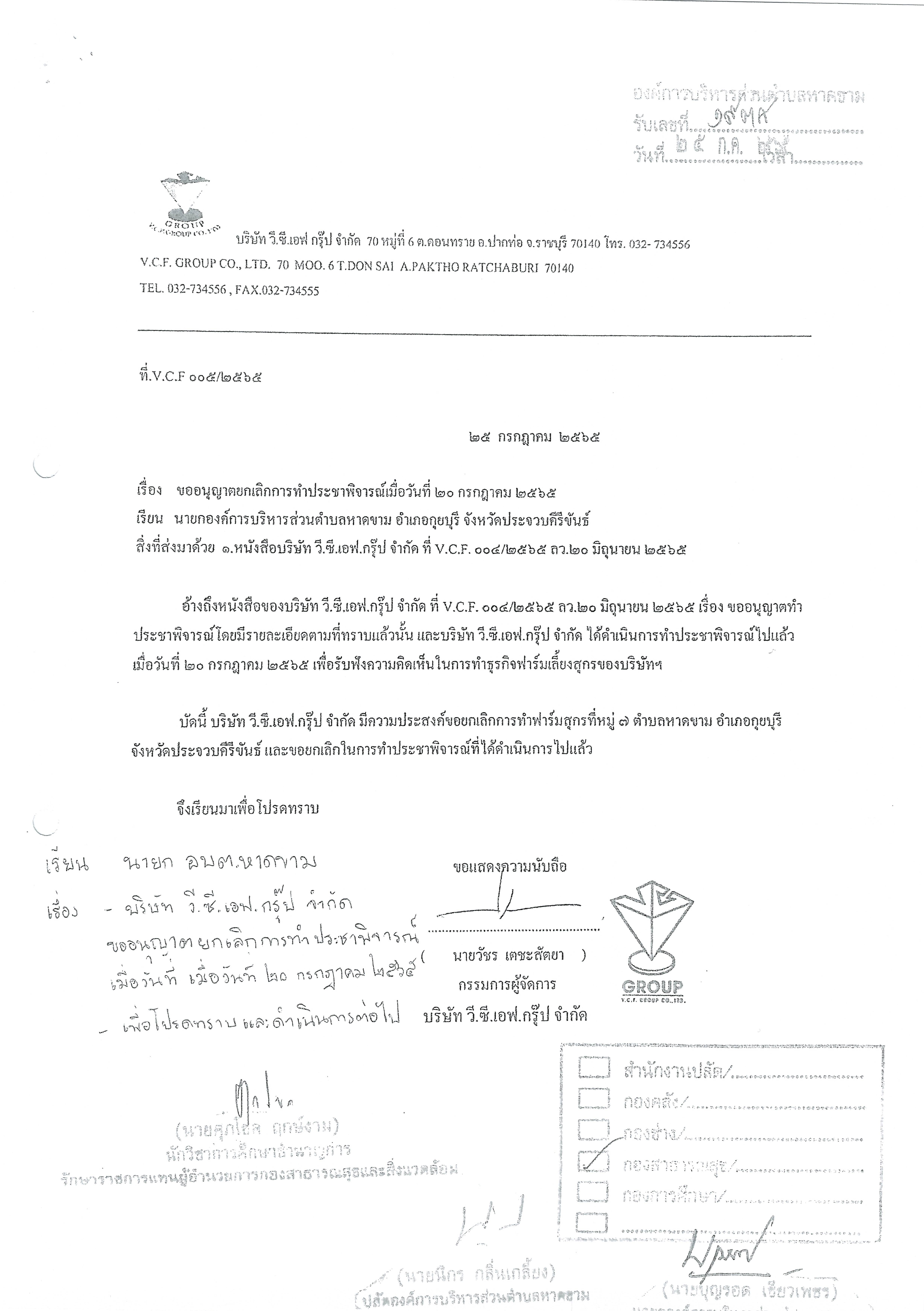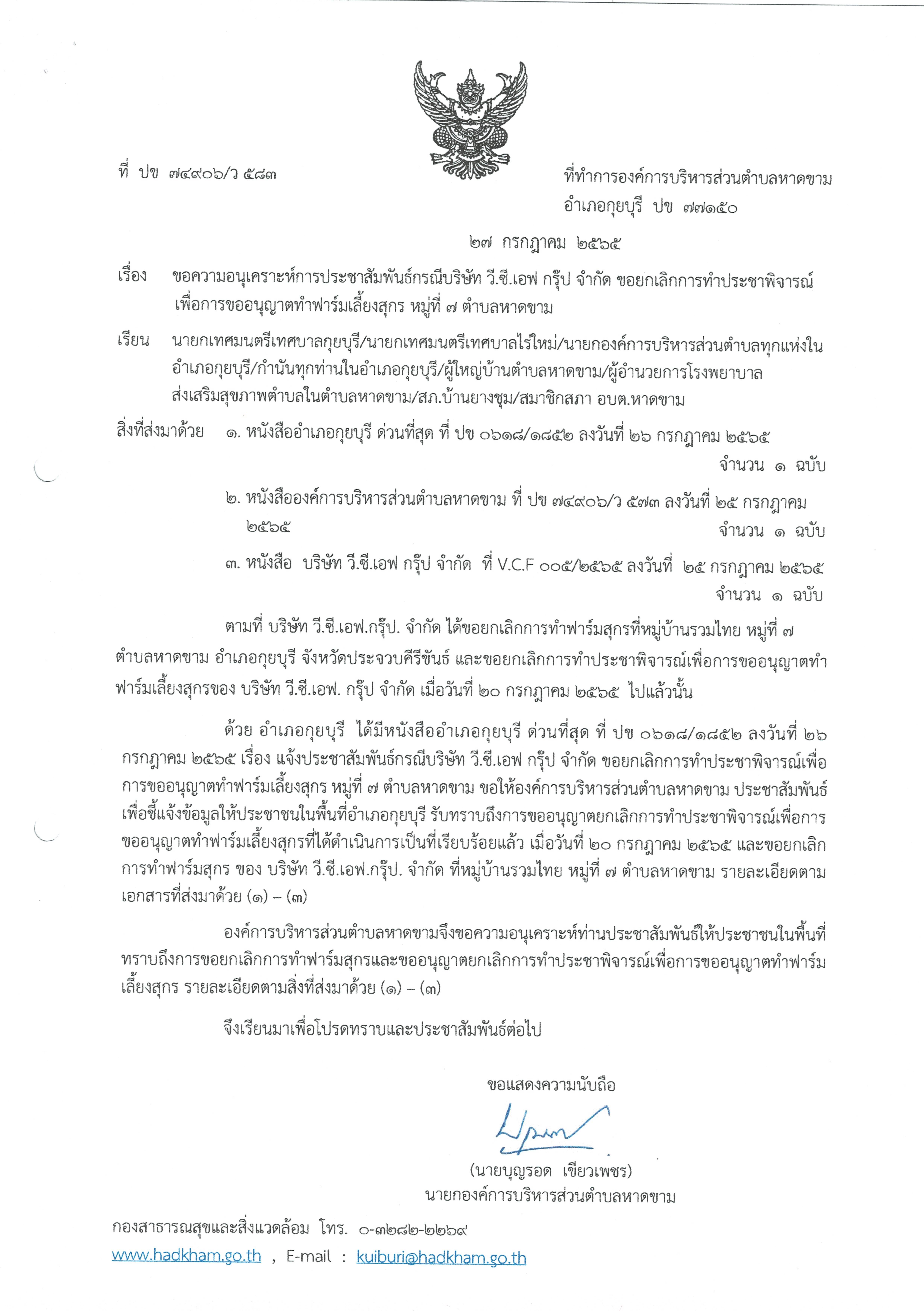 ขอความอนุเคราะห์การประชาสัมพันธ์กรณีบริษัท วี.ซี.เอฟ กรุ๊ป จำกัด ขอยกเลิกการทำประชาพิจารณ์เพื่อการขออนุญาตทำฟาร์มเลี้ยงสุกร หมู่ที่ 7 ตำบลหาดขาม